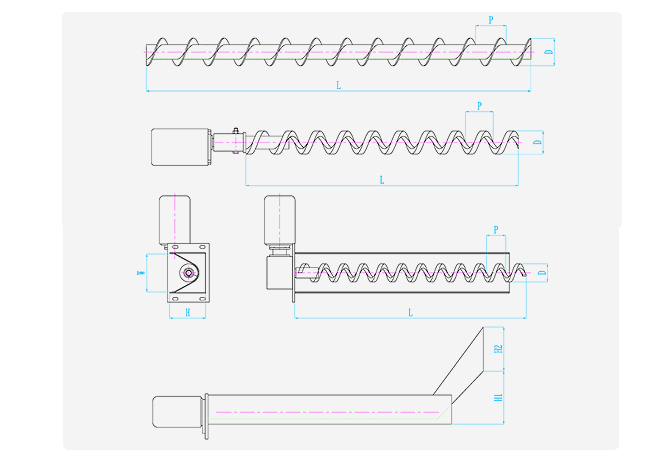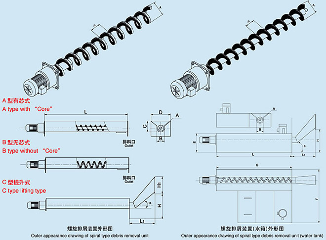 ZDLX系列螺旋排屑裝置是由減速機、螺旋體及殼體三部分組成。通過減速機驅動螺旋體轉動,與殼體產生相對運動,從而將切屑沿殼體軸向推出。根據使用情況,結構形式可分為: